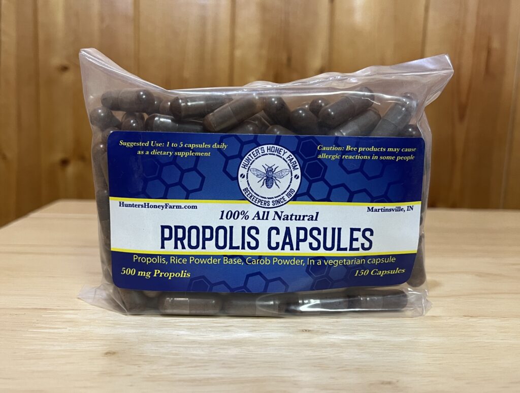 Propolis is made by honey bees as they collect the resins of various trees and flower buds. The bees use this wax like compound to repair damage to the hive and sanitize their home.