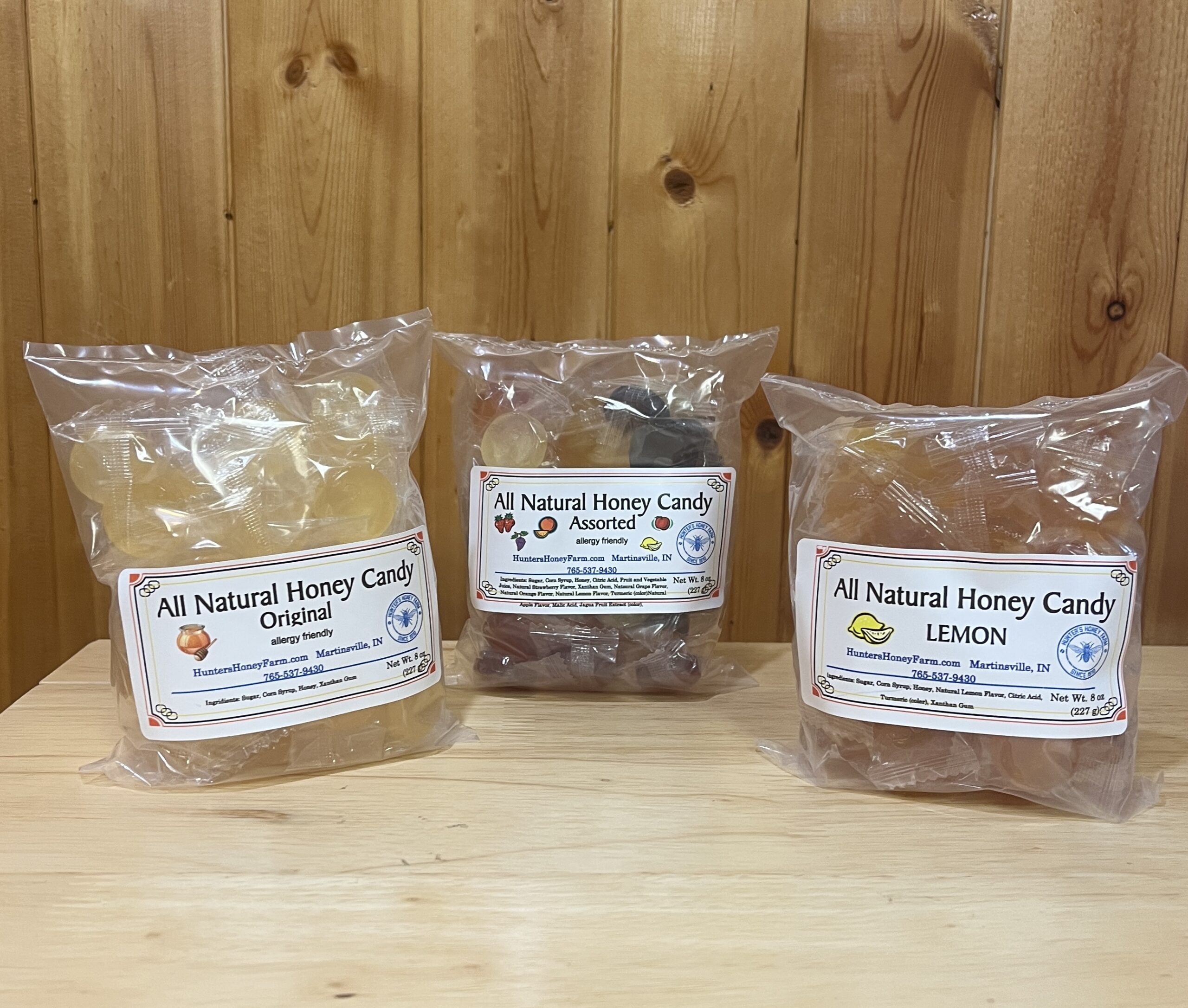 Skip to contentOur delicious all-natural honey candy is just as advertised, with no artificial flavoring or coloring of any kind! Choose from three flavors: original, assorted, and lemon. Available in 8-ounce bags.