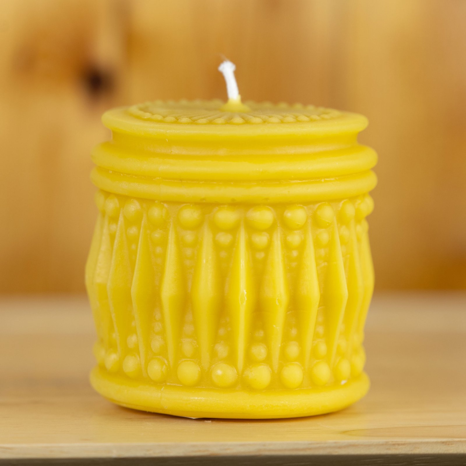 Skip to content100% Pure Beeswax Candle, 3.25″ x 4″ solid beeswax pillar with Greek architectural influence. Burn time is approximately 60 to 70 hours. Natural beeswax color